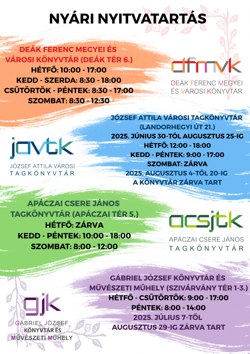 Könyvtáraink *nyári nyitvatartásáról* a mellékelt plakáton tájékozódhat.