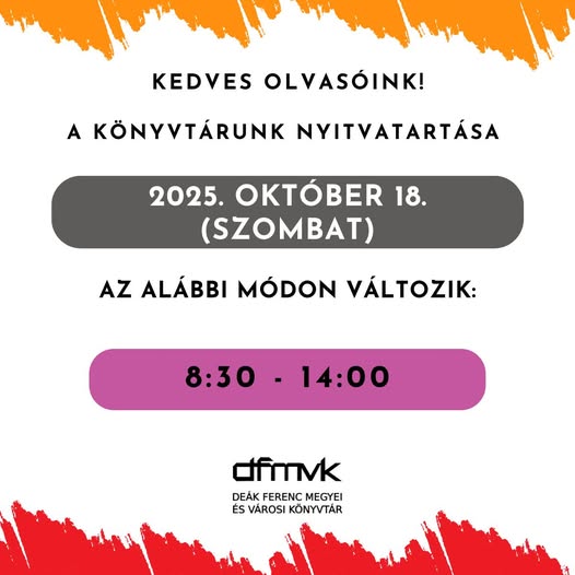 *2025. október 18*-án a könyvtár *8.30-tól 14.00* *óráig* várja az