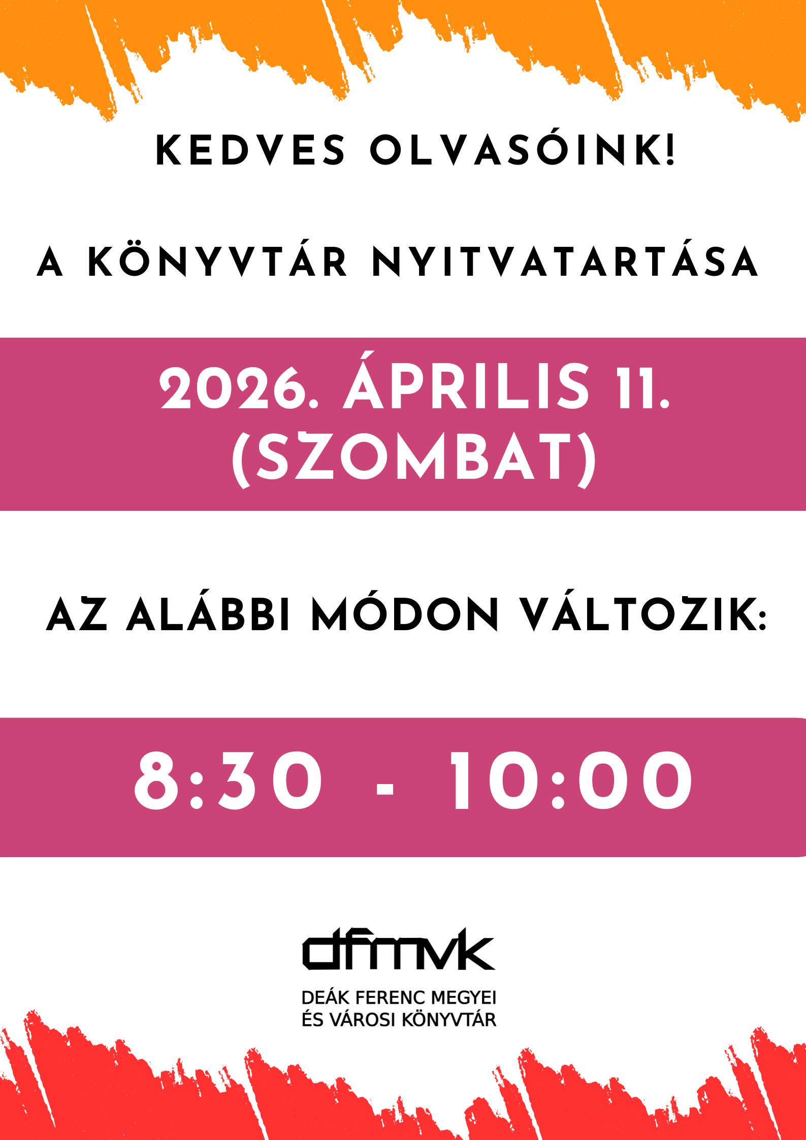 *könyvtárunk 2026. április 11-én 8.30-tól 10 óráig *tart nyitva.